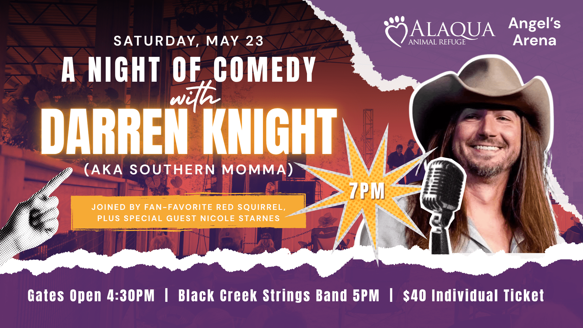 Get ready for an unforgettable night of laughter, music, and Southern charm at Angel’s Arena at Alaqua Animal Refuge!