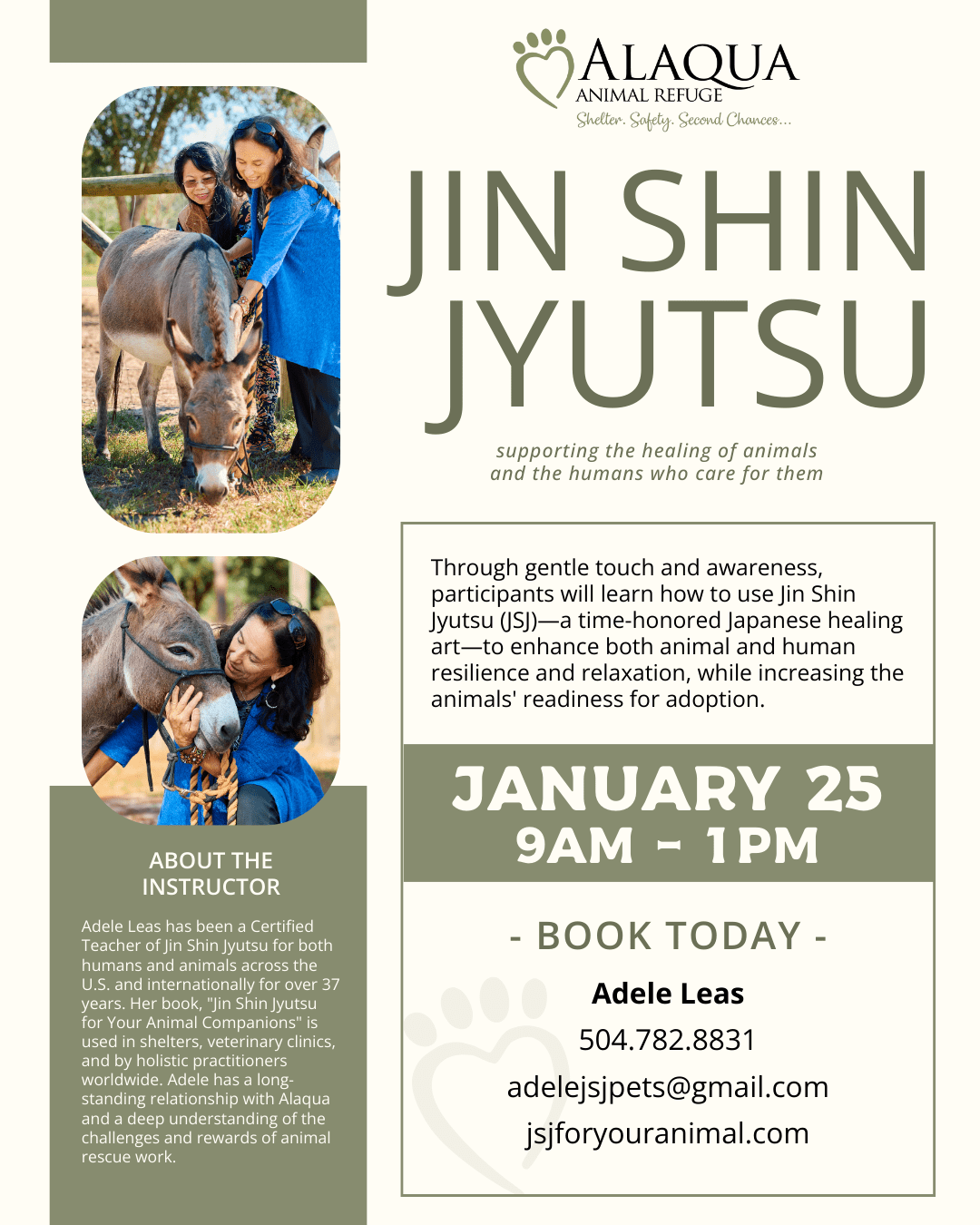 About the Instructor: Adele Leas has been a Certified Teacher of Jin Shin Jyutsu for both humans and animals across the U.S. and internationally for over 37 years. Her book, “Jin Shin Jyutsu for Your Animal Companions” is used in shelters, veterinary clinics, and by holistic practitioners worldwide. Adele has a long-standing relationship with Alaqua and a deep understanding of the challenges and rewards of animal rescue work.