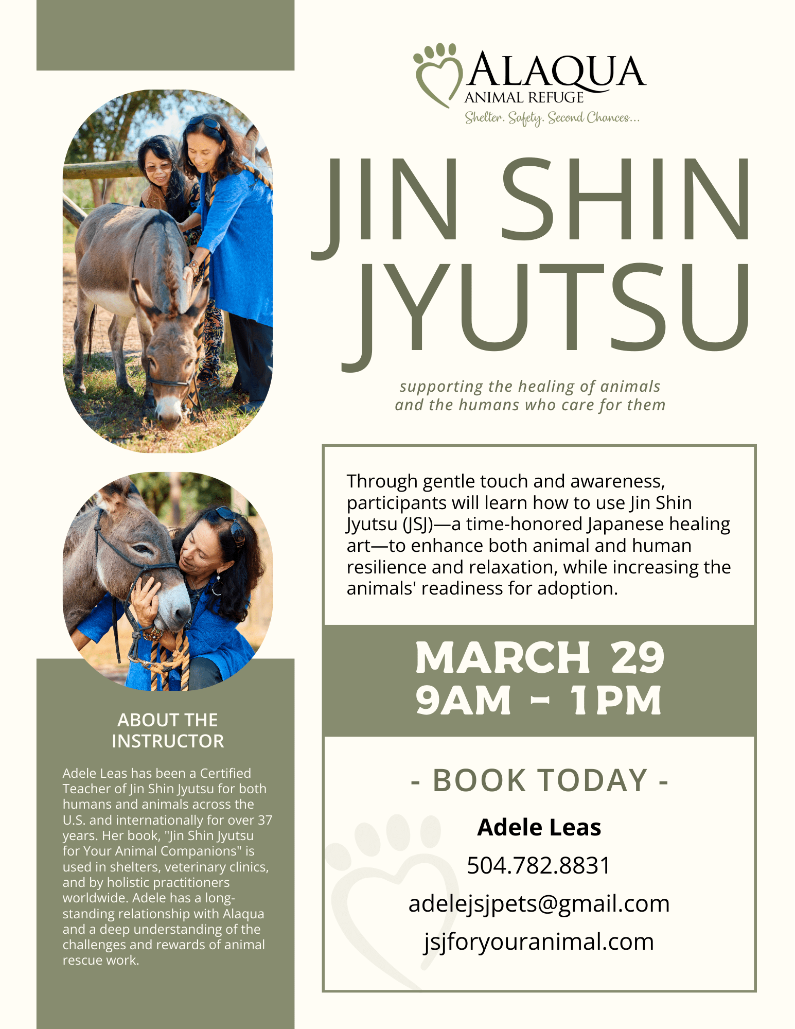 About the Instructor: Adele Leas has been a Certified Teacher of Jin Shin Jyutsu for both humans and animals across the U.S. and internationally for over 37 years. Her book, “Jin Shin Jyutsu for Your Animal Companions” is used in shelters, veterinary clinics, and by holistic practitioners worldwide. Adele has a long-standing relationship with Alaqua and a deep understanding of the challenges and rewards of animal rescue work.