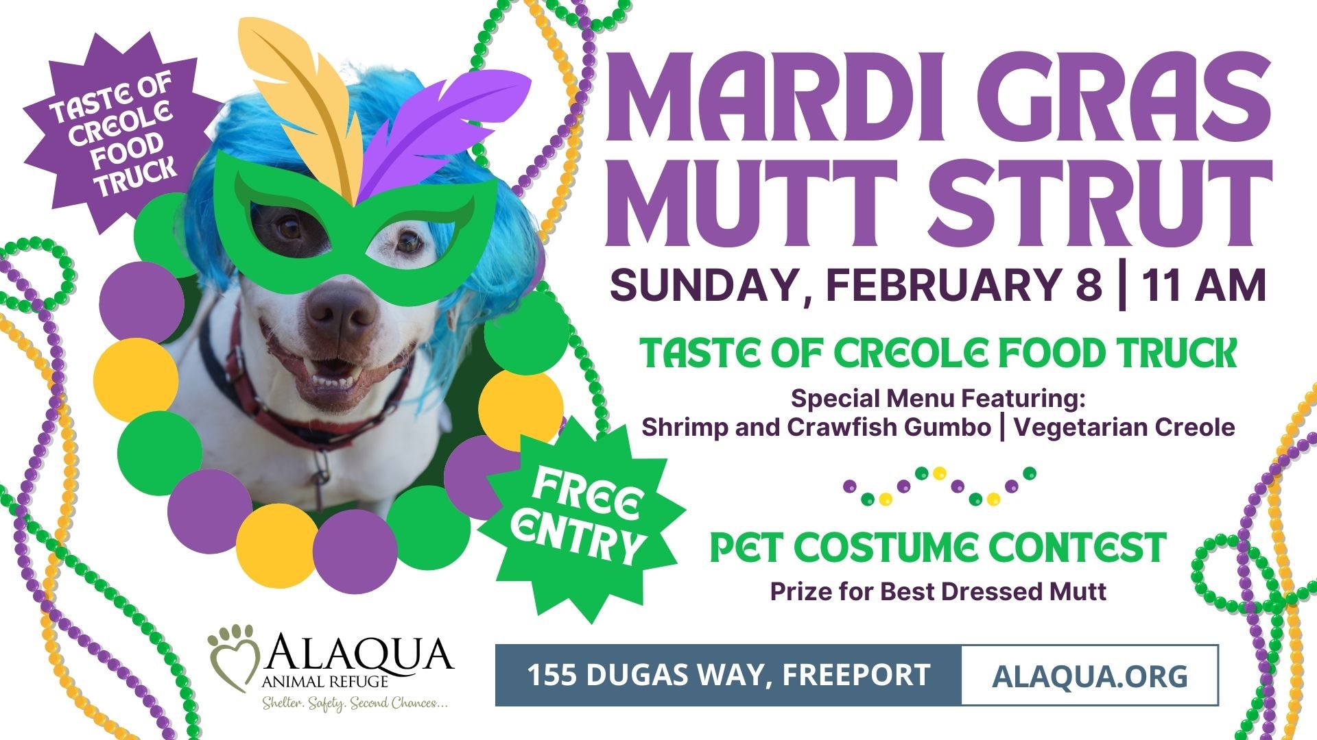 Get ready to strut your stuff at our Mardi Gras Mutt Strut on February 8th at 11am! Dress your pup in their most festive Mardi Gras look and join us in Alaqua’s Arena for an afternoon of fun. Enjoy delicious bites from Taste of Creole, a wonderful local food truck, cheer on your favorite four-legged contestants, and see who takes home the prize for best dressed mutt in our judged costume contest!