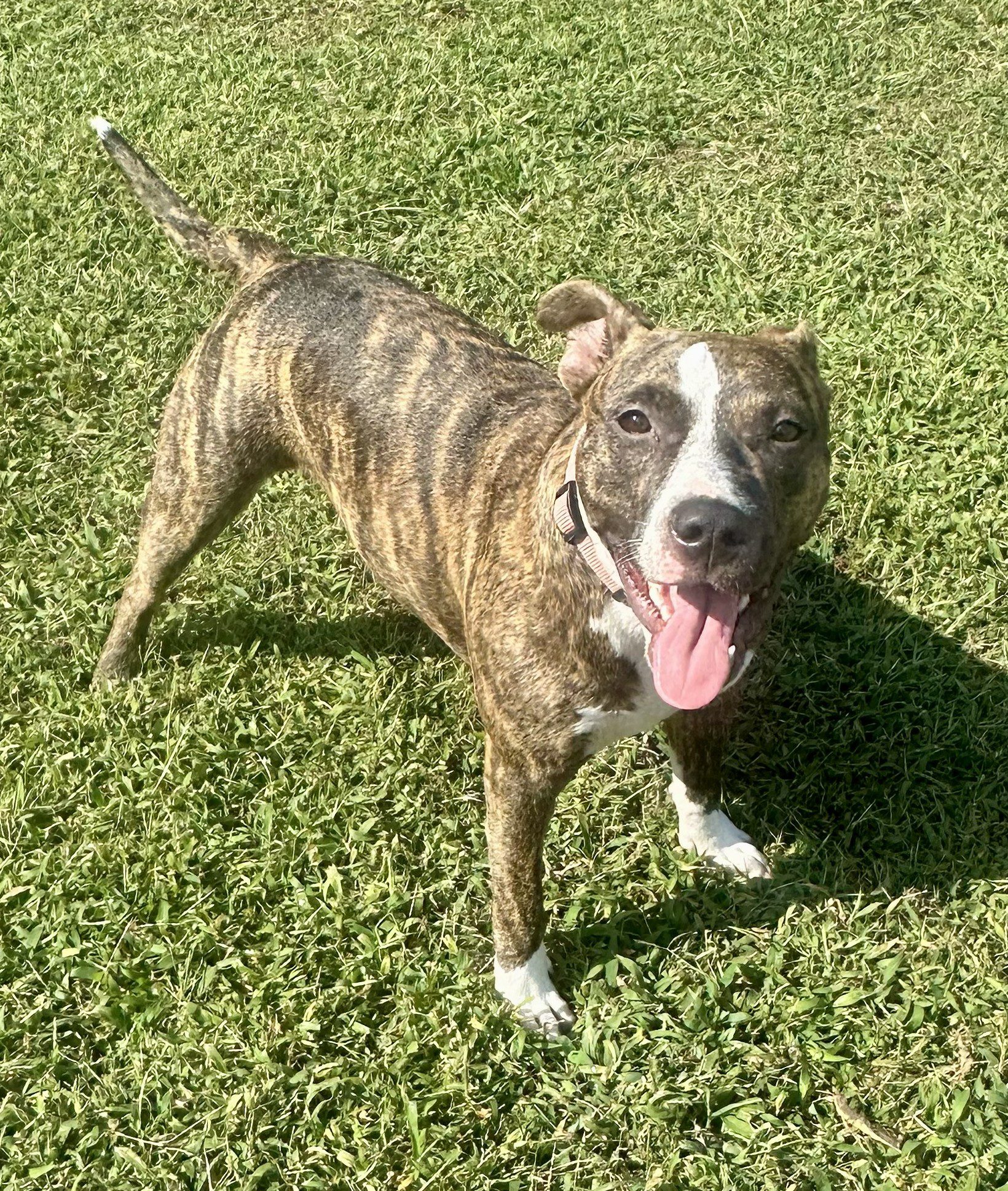 June is a 1-year-old spayed bully mix we found abandoned and underweight last summer. She’s now healthy, fully vaccinated, house-trained, and knows basic commands. Affectionate and active, she loves walks, yard time, and snuggles. She needs daily exercise and enrichment and has separation anxiety, so someone must be home part of the day. We cannot keep her due to our special needs child. Best in a calm home with older kids and a secure yard.