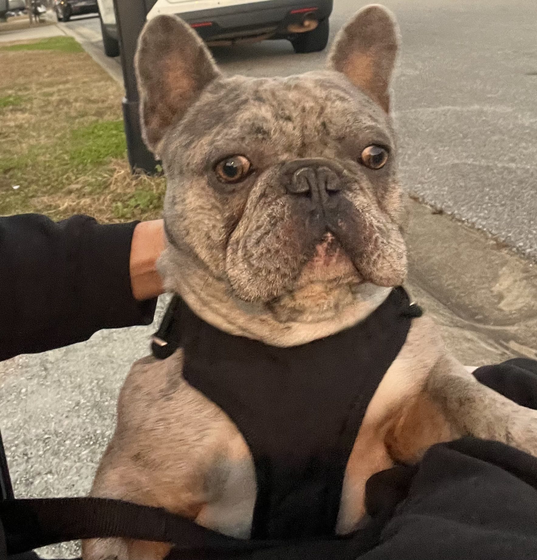 Spud is a 4 year old Merle French bulldog. He is neutered and very sweet. Great with kids. He had another dog in home and was able to adjust after a few days.